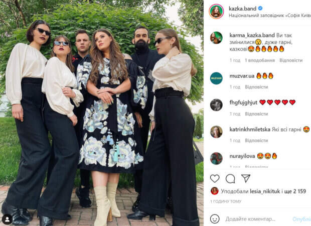 Зарицкая умеет выгодно подчеркнуть свои формы. Для своих выступлений она нередко выбирает эффектные платья в пол. В этот раз Александра позировала в черном вышитом платье. Было видно, что певица немного похудела. Рядом с ней позировали коллеги по группе и красотки из балета. «Группа KAZKA поздравляет вас с днем вышиванки! Мы живем в прекрасной стране с богатой историей! П.С. Мы такие красивые не просто так) сегодня мы поем для лауреатов Шевченковской премии», - подписала фото Зарицкая. В комментариях ей оставили массу приятных слов. «Боже, красота какая», «Какие все красивые», «Вы так изменились, очень красивые, сказочные», «Вы красивые, талантливые и светлые люди!», «Любим Вас!», «У вас прошло «Время перемен», «Незаконно быть такими красивыми и культовыми», - пишут пользователи сети. Ранее мы писали, что Зарицкая показалась с синим макияжем на глазах и блестящими камнями на волосах. Напомним, что солистка KAZKA с глубоким декольте увлеклась фильтрами, поразив внешним видом: неожиданные кадры. Как сообщала Politeka, солистка KAZKA засветила тату на пикантном месте, расслабившись в сауне: "Теперь мышцы...". Также Politeka писала, что солистка KAZKA в купальнике не стала скрывать пышные формы: кадры из джакузи.