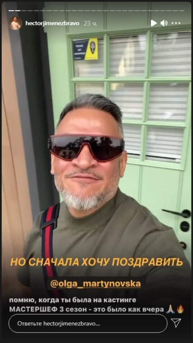 В 2015 году она заработала фуд-продюсером шоу, а далее ее пригласили на проект в качестве судьи. Эктор и Ольга очень сдружились благодаря шоу. 2 сентября Мартыновская отметила свое 32-летие. Хименес-Браво решил поздравить коллегу и записал сторис, в котором не смог сдержать эмоций. "Помню, когда ты была на кастинге "Мастер Шеф" 3 сезон - это было, как вчера", - подписал видео ресторатор. "Сегодня день рождения у Оли Мартыновской! Оля, я помню, когда ты пришла на кастинг "Мастер Шеф" третий сезон! Боже мой, это было будто вчера... Как круто, что ты работаешь со мной сейчас на нашем проекте "Мастер Шеф". Я люблю тебя, ты крутая!", - Эктор признался в чувствах экс-участнице и судье шоу, а в конце спел "Happy Birthday to You". Отметим, Ольга Мартыновская родом из Николаева, она переехала на ПМЖ во Францию. Там она снимала квартиру у француженки, которая увлекалась кулинарией и обучила будущую судью украинского шоу секретам приготовления местных соусов. Напомним, Эктор Хименес-Браво поиздевался над новыми участниками "Мастер Шеф" А еще Politeka писала, что Хименес-Браво из "Мастер Шеф" со своей любимицей на руках сообщил радостную новость Также Politeka сообщала, что счастливый Хименес-Браво показал свою любимицу сразу после душа