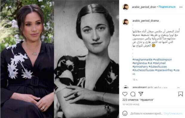 Так, беременная вторым ребенком герцогиня Сассекская предстала в шелковом черном платье с белым узором от Giorgio Armani, туфлях от Aquazzura, а также подвеске от Pippa Small, серьгах Birks и браслете Cartier. Меган собрала волосы в хвост, сделав пробор посередине и высвободив несколько локонов по бокам. Примечательно, что Симпсон, в свое время, позировала для портрета в подобом образе, только почти сто лет назад. В Сети опубликовали показательный фотоколлаж со знаменитостями. "Некоторые указали, что наряд Меган во время ее интервью с Опрой Уинфри и ее прическа очень похожи на американскую Уоллис Симпсон, которую дед принца Гарри любил и отрекся от престола, чтобы жениться на ней