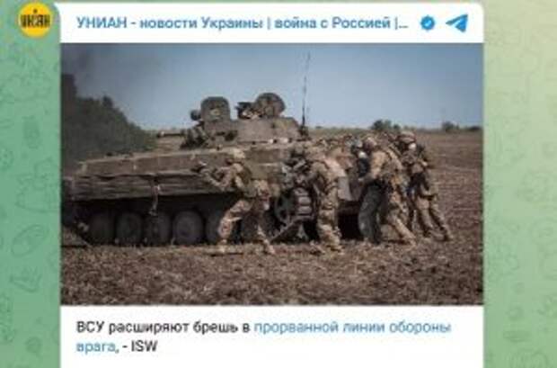Украинское агентство УНИАН проиллюстрировало материал о наступательных действиях ВСУ фотографией группы людей с пистолетами для пейнтбола. Соответствующий пост размещен в Telegram-канале СМИ. На снимке запечатлены несколько человек в военной экипировке, которые идут в атаку возле тяжелой техники. Однако при более пристальном рассмотрении снимка можно увидеть, что они вооружены пейнтбольными маркерами.