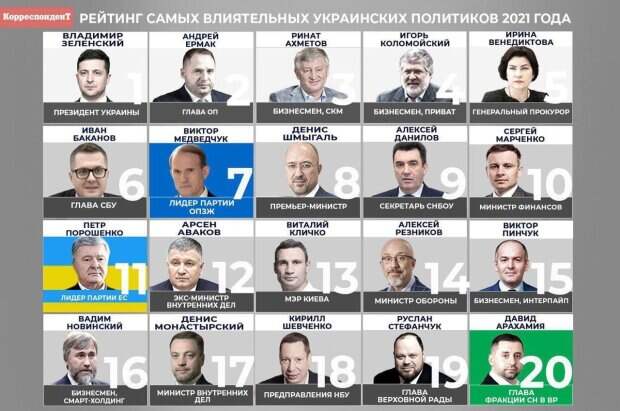 Самые влиятельные по версии издания "Телеграф" В рейтинге издания "Телеграф" "Слугу народа" представляет лишь глава парламентской фракции Давид Арахамия, который расположился на 10-м месте. При этом главы партии Елены Шуляк в рейтинге вообще нет. Собственно, кроме Арахамии, в списке нет никого из СН. И это партия, которая получила после выборов монобольшинство в Раде. Но политических лидеров за это время она так и не воспитала. Более того, СН не ведет никакой работы по развитию в регионах. Простыми словами, "Слуга народа" существует лишь на бумаге как бренд, который держится на узнаваемости Владимира Зеленского. А поскольку рейтинг Зеленского падает, то катится вниз и "Слуга народа", и вытянуть ее из этого пике будет некому. А вот ОПЗЖ, которая за эти два с половиной года существенно нарастила рейтинг, представлена в рейтинге сразу тремя политиками. Первый из них – председатель политического совета Виктор Медведчук, который занял 5-е место и вообще единственный, кто попал в первую десятку и при этом никак не связан с властью. Даже под домашним арестом он руководит партией, проводит заседания политсовета у себя дома. 20-е место в списке "Телеграфа" занял сопредседатель ОПЗЖ Юрий Бойко. ОПЗЖ растет. Во многом это заслуга Медведчука и следствие его активной работы в направлении мира на Донбассе, примирения с РФ, восстановления экономики и снижения коммунальных тарифов. Петр Порошенко, который борется за возможность еще раз сразиться с Зеленским на выборах президента, занял лишь 15-к место. Его "Европейская солидарность" уперлась в потолок своих возможностей. Да и сам Порошенко пытается, скорее, зацементировать свое электоральное поле, нежели его расширить. В партии, где собрано столько бывших видных чиновников и политиков, не нашлось никого, кто мог бы попасть в первую двадцатку рейтинга самых влиятельных лиц. Лидер "Батькивщины" Юлия Тимошенко – 16-я. Как оценить эту позицию некогда самого влиятельного (два года подряд в конце нулевых) человека страны? Видимо, время Тимошенко безвозвратно уходит. Стоит отметить, что "Батькивщина" – это образцовая партия для украинских реалий. Она живет, ведет работу в регионах, имеет много членов. Но при этом политсила угасает, потому что угасает харизма ее лидера. Отметим здесь также Дмитрия Разумкова, который ушел от "слуг" и уже собрал в Раде депутатское объединение "Разумная политика" – с прицелом на будущие выборы. 14-е место Разумкова стало возможным благодаря его разрыву с президентской партией. Однако глобальные выводы о перспективах "Разумной политики" и ее лидера делать рано, поскольку здесь нет ни толковой команды, ни организации. Это, скорее, аванс на будущее, который еще нужно реализовать. Топ-100 самых влиятельных по версии газеты "Вести" Из политических лидеров в первой десятке выше всех Виктор Медведчук - на пятом месте, и это еще один плюс в копилку ОПЗЖ и ее перспектив в будущем. Конфликт с Зеленским показал, что лидер ОПЗЖ от него только выиграл. Это подчеркнуло его политический вес в Украине. К тому же он сохраняет за собой статус полноценного канала связи между Киевом и Москвой, а Путин лично требует от Зеленского освободить своего соратника. Важно и то, что Медведчук — единственный, кто пользуется доверием представителей ОРДЛО в вопросе обмена удерживаемыми лицами. То есть Медведчук имеет к