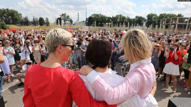 Как бы в доказательство того, что совпадение не случайно, поддерживающая Тихановскую Вероника Цепкало призвала собравшихся прийти на выборы 9 августа с белыми браслетами.