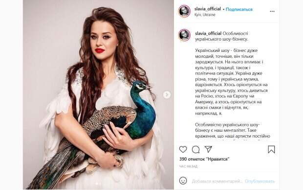 net, певица посвятила новый пост в своем Инстаграм отечественному шоу-бизнесу и его особенностям. Так SLAVIA отметила, что украинские звезды отличаются от других своим менталитетом. «Такое впечатление, что наши артисты постоянно соревнуются между собой. Это какой-то спортивный подход…Поэтому, люди не хотят делиться знаниями, утаивают информацию, берегут свои секреты для того, чтобы остаться на плаву…У нас наоборот: кто-то занял свое место, и не хочет делиться ничем, чтобы, не дай Бог, ничего не потерять. Это психология нищего», - рассказала певица. Она также отметила, что для музыкантов в Украине важно сохранять национальный колорит, ведь именно он может стать их изюминкой на мировой арене. «Чтобы выделяться из многих, лично для меня важно сохранить СЕБЯ. Я стараюсь быть не лучше кого-то, а ОДНОЙ такой», - рассказала Ярослава о своем подходе. Она также рассказала, что сейчас у украинских артистов есть возможность самим создавать новые тренды. Певица сопроводила свой пост новым фото, на котором она позирует в наряде из белых перьев и с бисерной вышивкой. В руках звезда держит павлина. Поклонники тут же отреагировали на пост певицы. «Вы очень красивая женщина и певица», «Магическая», «Ой какое фотооо! !! Ты, и эта чудесная Королевская Птица вместе! Вы – Прекрасны», «Прекрасная красавица! Все сказано правильно! Слава у тебя столько позитива, как ты хороша в середине и сверху», - пишут люди. Напомним, Михаил Хома выдал Осадчей, что происходит в его семье. Как сообщала Politeka, жена DZIDZIO в сетке и высоких сапогах дала совет женщинам, как изменить свою жизнь. Также Politeka писала, что жена DZIDZIO откровенно поделилась своими "взрослыми" фантазиями: "Меня вдохновил...".