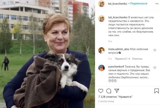 "В животных нет зла, предательства и ненависти. Это люди пытаются переложить ответственность за своих демонов на тех, кто слабее, но безупречнее, чем они", - говорится в подписи к публикации. "Моя любимая актриса", "Танечка, Вы правы, самые верные и преданные. Без лжи и подлости, Это сир наших любимых барбоскиных, кисок..", "Да я всегда считаю,животные человечнее людей,мои самые лучшие ,я их обожаю,у меня две кошки,один кот,и собака Жорик", "Вы же наша любимая девочка", "Вас я люблю,Вы талантище", "Согласна! Пошла выгуливать друга", "Чем больше узнаем людей, тем больше нравятся собаки", " Татьяна,я сама волонтёр. Обожаю животных", - написали фанаты в комментариях. Ранее мы рассказывали, как Татьяна Кравченко растрогала сердца публики ярким кадром с домашним питомцем - песиком породы шпиц. "Как бы ни было порой тяжело, улыбайтесь и смело идите вперед. Пусть улыбка живет не только на лице, но и в глазах, и в сердце, и в душе", - говорится в подписи. Напомним, что Валюха из "Сватов" неожиданно облила грязью собственного мужа Как сообщала Politeka, новые "Сваты" выйдут без любимых героев, заменить невозможно Также Politeka писала, что Валюха из "Сватов" огорошила появлением в вышиванке