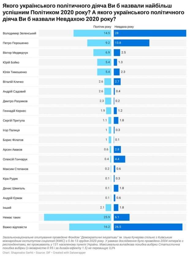 В то же время, Зеленский лидирует и в номинации «Неудачник года» с результатом 28,0%. «Можно сказать, что в 2020-м году Украина осталась без Политика года. Относительное большинство в этой номинации украинцы отдали действующему Президенту В. Зеленскому, но даже его назвали политиком года только 15%», – говорится в пресс-релизе КМИС и фонда «Демократические инициативы». Как отмечают КМИС и «Демократические инициативы», Порошенко, занявший второе место, также получил вторую позицию в рейтинге «Неудачник года». «Еще более уверенно оба политика возглавляют народный рейтинг «Неудачник года» – действующего Президента считают неудачником года 28%, П. Порошенко – 14%... Напомним, в прошлом году В. Зеленского политиком года считали 46% украинцев», – напоминают КМИС и «Демократические инициативы». В то же время, по такому показателю как баланс позитивных и негативных оценок лидирует председатель политсовета «Оппозиционной платформы – За жизнь» Виктор Медведчук. По данным опроса КМИС и фонда «Демократические инициативы», Виктор Медведчук продемонстрировал наилучший показатель – «плюс» 4,4%. 6,9% опрошенных назвали Медведчука политиком года, только около 2% оценили его деятельность негативно. Следом за Медведчуком идут такие политики как сопредседатель партии «Оппозиционная платформа – За жизнь» Юрий Бойко (5,4% против 1,3%) и глава ВО «Батькивщина» Юлия Тимошенко (5,4% против 2,3%). Общенациональный опрос проведен фондом «Демократические инициативы» им. Илька Кучерива совместно с Киевским международным институтом социологии (КМИС) с 5 по 13 декабря 2020 года во всех регионах Украины, кроме Крыма и отдельных районов Донбасса. Опрос проводился методом личного интервью face-to-face, было опрошено 2004 респондентов, проживающих в 131 населенном пункте Украины. Статистическая погрешность выборки не превышает 3,3%. Финансирование опроса проводилось в рамках проекта MATRA Посольства Королевства Нидерландов.