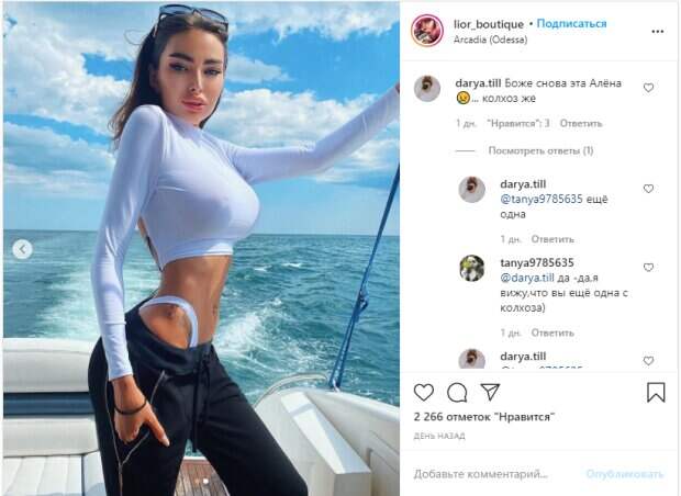 Все дело в том, что Омович после нескольких пластических операций сделала себе бюст шестого размера, а также регулярно пользуется филлерами для лица – подкалывает губы, скулы и придает форму лицу в целом. Благодаря соляриям кожа девушки всегда загорелая, даже в холодную погоду. Поэтому фото на яхте сразу не осталось без внимания. Модель надела короткий топ на шнуровке сзади, а также черные штаны, которые намеренно приспустила с бедер. Примечательно, что девушка для изюминки кадра также приподняла лямки белого белья, слишком сильно то натянув практически до талии. Вот что пишут в сети: «Какой удобный фон для ФШ талии
