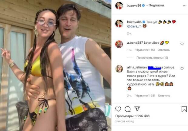 Об этом пишет Politeka.net со ссылкой на страничку знаменитости. "Танцуй", - написала звезда под фото. "Блин, а можно такой живот после родов ? кто в курсе?", "Немного на бабушку похожа с этой прической и в очках", "Для Давида старается быть худощавой. Он в теле женщину наверное любить бы не стал", "Почему Дава похож на Гену Букина", "Жесть, а не танец", "Оля с Давой стала очень соблазнительной и пластичной", "Оля выходи замуж за Даву, смотри как вы в паре танцует какой тандем", "Рожать тебе пора, Бузик", "Как на это смотреть противно". Мы писали, что известная российская телеведущая и певица Ольга Бузова, которая сейчас проводит время в теплых краях, рассказала, как для нее начался 2021 год. Так, Бузова опубликовала свое пляжное фото в купальнике и поделилась с фолловерами тем, что опасения относительно того, чтобы не "сгореть", были напрасными, так как на Мальдивах начались дожди. Напомним, тощая Бузова в леопардовом купальнике засветила все свои недостатки А еще Politeka писала, что бесстыжая Бузова в экстремальном бикини засветила свою розу между ног Также Politeka сообщала, что исхудавшая Бузова сверкнула фигурой в красном мини, озадачив видом