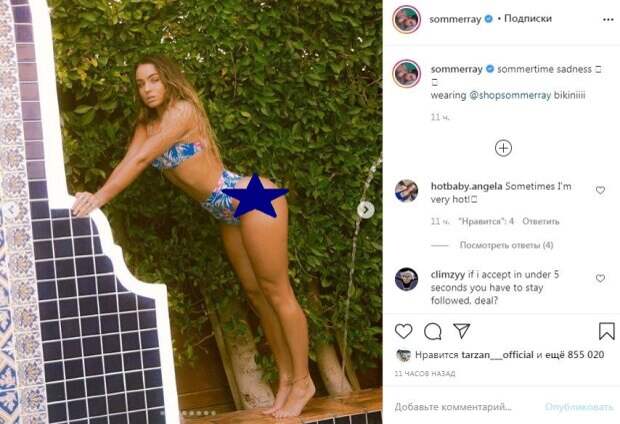 Верх купальника подчеркнул небольшую грудь звезды, а плавки на высокой посадке - тонкую талию. Золотая цепочка на шее, серьги в ушах и браслет на ножке придавали образу завершенности. Упругие ягодицы, накаченные ножки, ровная спинка - все в этих фото завораживает. Кроме того, модель распустила длинные светлые волосы, от чего вид у нее был будто у русалки. "Летнее время грусти", - подписала фото модель. За 11 часов пост собрал более 800 тысяч лайков и много комментариев. Пользователи сети написали массу комплиментов красотке за столь идеальные формы и попросили ее делиться подобными снимками почаще. Напомним, Соммер Рэй поделилась с поклонниками фото, на котором позировала в костюме для занятия спортом. На снимке на ней были лосины, которые обтянули ее подкачанные ножки и ягодицы. Образ дополнял короткий топ. «Я вернула цветочные наборы из розового золота с эффектом металлик», - сообщила звезда спорта своим поклонникам. Ранее мы писали, что Соммер Рэй показала себя в голубом купальнике с рисунками цветочков. Звезда стояла перед зеркалом и фотографировала себя на телефон, показывая фигуру. Волосы Соммер оставила распущенными, а руки украсила перстнями. Напомним, фитнес-модель Соммер Рей выставила напоказ загорелые ягодицы А еще Politeka писала, что фитнес-модель Соммер Рей потрясла наливными "яблочками" в слишком тесных шортах Также Politeka сообщала, что фитнес-модель Соммер Рэй покорила фигурой с бусами на самых интересных местах