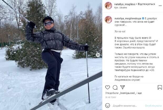 net. Наталья поделилась своим озорным настроем с поклонниками, и рассказала, что не собирается ныть, что устала от пробок и чистить машины. Она сделала несколько кадров на лыжах и покачалась в снегу. "В декабре они говорили, что зима не будет суровой… Ха-ха-ха!", - написала певица. Она подметила, что в прошлом году было всего восемь морозных дней, однако в этом - все не так. Певица заявила, что устала слушать нытье зануд, которые жалуются на снег и пробки. "Летом вы также будете возмущаться, когда температура поднимется до +30". Наталья позвала фанатов кататься на борде с Андреевского спуска, ставать вместе с ней на беговые лыжи, и брать санки и бежать на горки. "Зима не будет радовать нас вечно!", - подытожила певица "Чудово!", "Это же классно, а то расслабились все и забыли вообще что такое "зима". Кстати, сразу вспомнилась ваша песня "Зима "