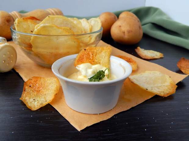 В чипсах из магазина слишком много красителей и усилителей вкуса, калорий в них также хватает. Вместо них лучше будет всего из одной картофелины сделать целую миску домашних чипсов. Жарятся они почти без масла. Ингредиенты: Одна картофелина Растительное масло Соль Вода Процесс: 1. Обычной овощечисткой нарезаем картошку на тонкие пластинки.