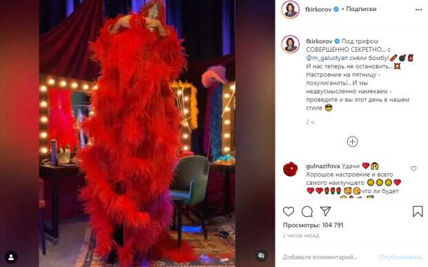 От красного цвета аж рябит в глазах. Певец предстал в золотисто-красном камзоле с высоким головным убором и аксессуаром из перьев, прикрепленным к рукавам. В какой-то момент артист распахнул их, а там - Галустян, с восторженно-удивленным выражением лица. Впрочем, и у Киркорова оно было таким же. Такое ощущение, что Бедросович "взял" Михаила в заложники. "Под грифом СОВЕРШЕННО СЕКРЕТНО... с @m_galustyan сняли бомбу!