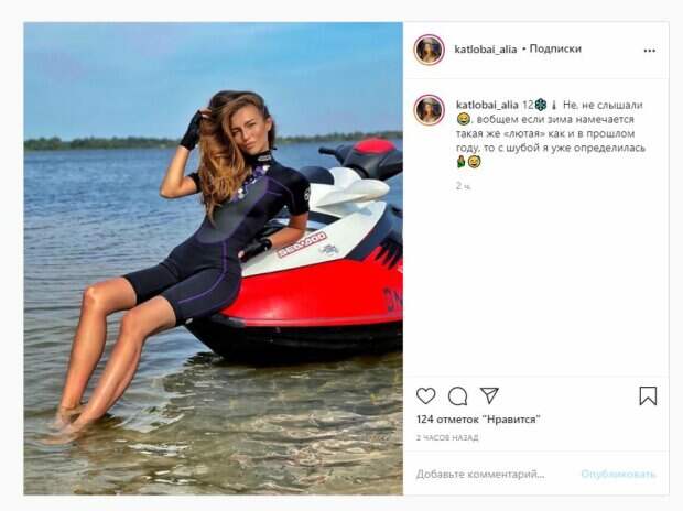 Известная фитнес-модель Алина Катлобай показала себя и рассказала о зиме На фото красотка показалась в спортивном закрытом купальнике. Образ Алина дополнила перчатками, а сама частично была в воде. Катлобай волосы оставила распущенными. Девушка соблазнительно выгнулась, позируя у водного мотоцикла. Об этом пишет Politeka.