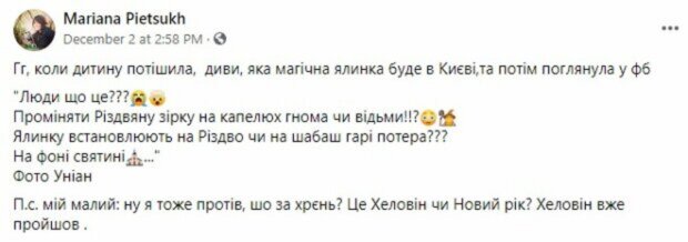 Совсем скоро должно состояться торжественное открытие - в День Святого Николая, 19 декабря. На верхушку елки повесили аксессуар в виде шляпы, и такое дизайнерское решение вызвало волну возмущений среди верующих христиан. Дизайн елки не сильно меняли, однако в этом году Киевская мэрия приняла решение проявить немного креатива и удивить киевлян и гостей столицы новым дизайном. Однако далеко не все оценили такой дизайн и саму концепцию в целом, а шляпу окрестили "ведьминым колпаком". Однако не обошлось и без положительных отзывов. В частности, киевлян порадовало, что впервые елку не срубили в Карпатах, а поставили искусственную. Ранее сообщалось, что на каркас вставили 500 тысяч веток и надели на макушку "шляпу". Сама елка получилась высотой около 31 метра и 97 тонн весом. Напомним, жители многоэтажки в Харькове оригинально украсили дом. Как сообщала Politeka, украинцы ополчились против новогоднего локдауна, ситуация на грани. Также Politeka писала, что вирус косит украинцев тысячами, у врачей опускаются руки.