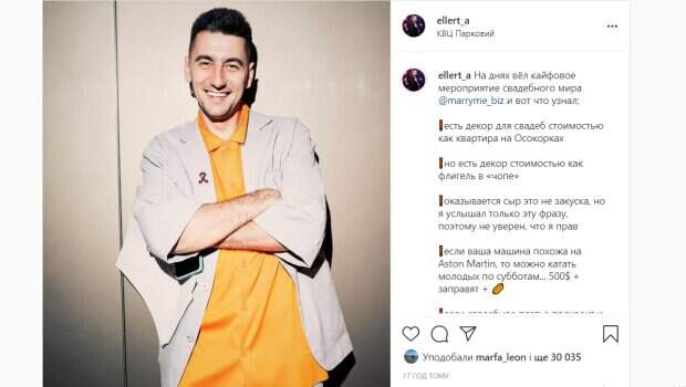 .. 500$ + заправят ⠀ - если свадебное платье подходит и жениху, то на него скидка и странный взгляд в след ⠀ - вино урожая 2020 самое может потому что не было ещё урожая 2021 ⠀ - было много всего, но я был не внимателен - работал", - написал Эллерт. "В следующем году вести не буду, буду с Ксю ходить и выбирать