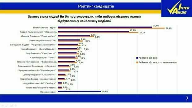 Согласно полученным данным, 23,6% киевлян поддерживают Виталия Кличко, который занимает пост мэра Киева уже два срока. Второе место с небольшим отрывом занимает Андрей Пальчевский, за которого готовы отдать голоса 17,8% опрошенных. При этом среди избирателей, которые уже определились с выбором, Кличко за кличко реришили голосовать 26,8%, а за Андрея Пальчевского – 20,2%. Как отметили социологи, с марта по июль текущего года Виталия Кличко стали поддерживать куда меньше жителей Киева, а вот лидер партии "Перемога Пальчевського" только наращивает свою популярность в столице. Рейтинг кандидатов на пост мэра Киева по результатам опроса выглядит следующим образом: Виталий Кличко – 26,8% Андрей Пальчевский – 20,2% Николай Томенко – 9,1% Александр Попов – 6,2% Андрей Билецкий – 5,7% Ирина Верещук – 5,4% Игорь Смешко – 5,3% Сергей Притула – 5,0% Алексей Гончаренко – 4,8%. Как показало исследование, у партии «Удар» намного меньше симпатий, чем у ее руководителя, Виталия Кличко - политсилу готовы поддержать только 9,8% избирателей. Больше всего киевлян выбирают "Европейскую солидарность" - 17,2%, на втором месте оказалась "Перемога Пальчевського" - 15,7%, а замыкает тройку лидеров "Слуга народа" с рейтингом 11,5%. Напомним, Пальчевский раскрыл, почему решил идти в мэры Киева: «Обязан…» Как сообщала Politeka, Андрей Пальчевский назвал виновных в ситуации с китайским вирусом в Украине Также Politeka писала, что Пальчевский рассказал, какие вопросы в Киеве требуют срочного вмешательства