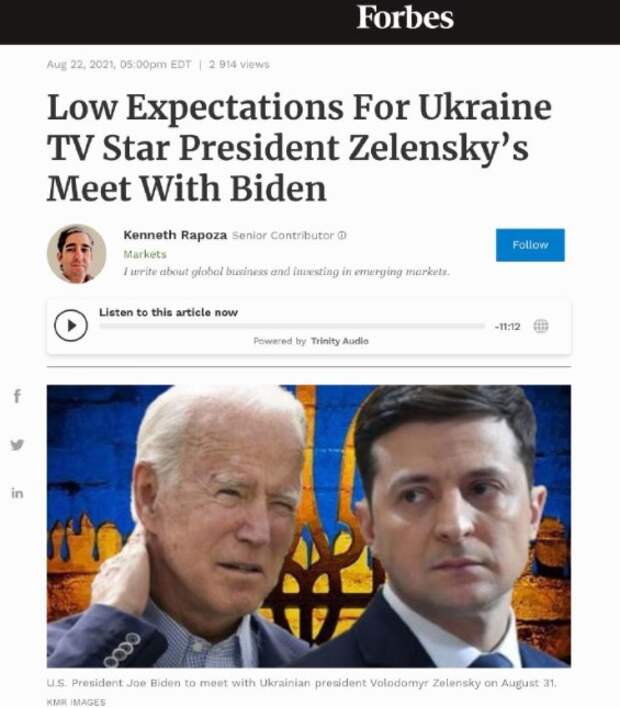Накануне визита Зеленского в США в издании Forbes (а это вам не National Interest) вышла большая аналитическая статья о перспективах его переговоров с Джо Байденом. Собственно, название статьи «Встреча украинского телезвезды-Президента с Байденом: незначительные ожидания» само за себя говорит, что автор Кеннет Рапоза не особо верит, что переговоры в Вашингтоне дадут какой-то результат.
