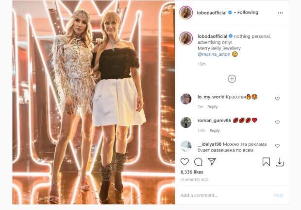 Голову звезда украсила оригинальным украшением из камней, которое прекрасно дополнило образ. Лобода положила руку на плечо своей спутнице, которая появилась в кадре в коротком стильном платье с черным верхом, обнажившим плечи, и белой юбкой. Марина сверкнула стройными ножками и украсила их сапожками с блестящим декором. Изюминкой образа мамы стало серебристое ожерелье на шее и завитые длинные волосы. "Ничего личного, исключительно реклама", - подписала Светлана Лобода. Пользователи социальной сети в комментариях засыпали красоток приятными комплиментами и похвалили за честность: "Света, вы просто огонь. Хочу сделать обзор на ваше руководство по уходу за кожей"; "На такую рекламу я готова смотреть вечно