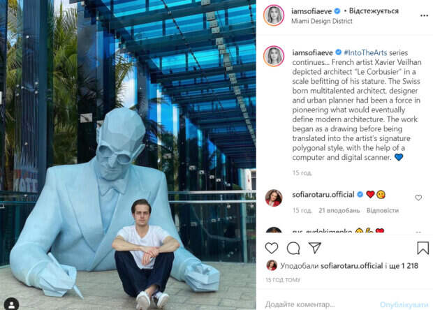 .. Французский художник Ксавье Вейлан изобразил архитектора Ле Корбюзье в масштабе, соответствующем его росту. Родившийся в Швейцарии разносторонний архитектор, дизайнер и градостроитель был одним из первых, кто создал то, что в конечном итоге определило современную архитектуру. Работа началась с рисунка, а затем была переведена в фирменный многоугольный стиль художника с помощью компьютера и цифрового сканера», - решила устроить образовательную минутку для поклонников Соня. В комментариях ей оставили несколько положительных отзывов. «Классная скульптура», «Хорошие люди сразу видны!! Тебе только удачи и счастья», «Супер», «Люблю это место», - пишут пользователи сети. Как известно, у Софии Ротару один сын и двое внуков. Женщина очень близка со своей семьей. Недавно в сети появился снимок, на котором все семейство собралось возле елки. Напомним, что внучка Ротару, собравшаяся замуж за миллионера, показала хищную натуру: "У нее дикие...". Как сообщала Politeka, миниатюрная племянница Ротару показала, на что тратит деньги: «Пусть твои мечты…». Также Politeka писала, что постаревшая Ротару не смогла скрыть глубоких морщин без фотошопа, кадры закулисья: "Бедная, говорит уже еле-еле".