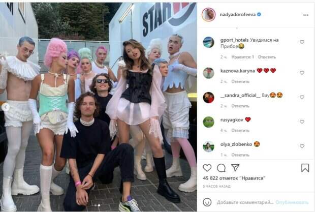 Причем на выступлениях Надя появляется в максимально ярких и запоминающихся нарядах. В этот раз звезда выбрала нечто среднее между удобством и пикантностью. Полупрозрачный белый наряд с черным верхом и имитацией корсета выгодно сделал акцент не на талии, а на тонких ногах исполнительницы. Пышная укладка, привычный макияж и минимум украшений сделали Надю еще ярче, а вот удобные черные сапоги на массивной подошве придали образу некой дерзости. «Такая vecherinka была вчера на @svitsketv