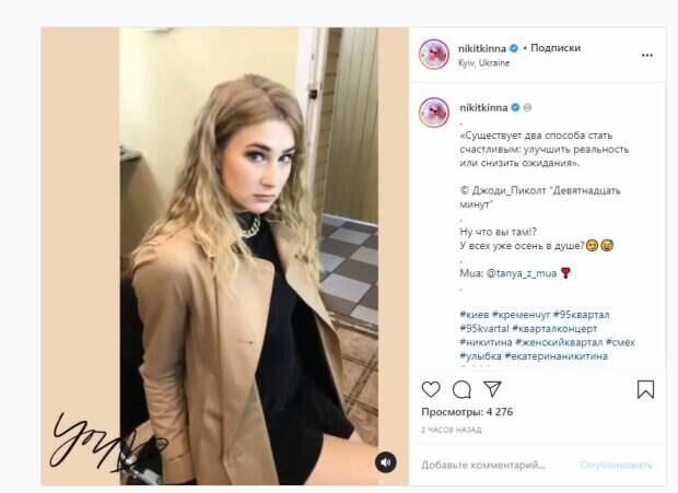 Об этом пишет Politeka.net со ссылкой на страничку знаменитости. "«Существует два способа стать счастливым: улучшить реальность или снизить ожидания». © Джоди_Пиколт “Девятнадцать минут” Ну что вы там!? У всех уже осень в душе?", - написала Никитина. Фанаты посмотрели кадры более 4 тысяч раз и написали комментарии: "Очень красивая", "Так я тебя вижу", "Красивая, как всегда", "Осень в душе) но отдых ещё как летом )", "Смотришь и видишь красоту", "Очень красивая девушка", "Кать, ты та самая девушка, в которую можно влюбиться на эскалаторе". Сообщалось, что актриса студии "Квартал 95" Екатерина Никитина поразила атлетическими способностями на тренировке. Знаменитая красотка опубликовала на своей странице в социальной сети "Инстаграм" короткий ролик, в котором исполнила зрелищный трюк. Она предстала перед поклонниками в черной футболке и обтягивающих велосипедках такого же цвета. Напомним, блондинка из "Квартал 95" эффектно села на шпагат, не оставив равнодушных Также Politeka писала, что молодая красотка из "Квартал 95" поразила внешним видом после перевоплощения А еще Politeka сообщала, что блондинка из "Квартал 95" поразила "персиком" в колготах в сеточу