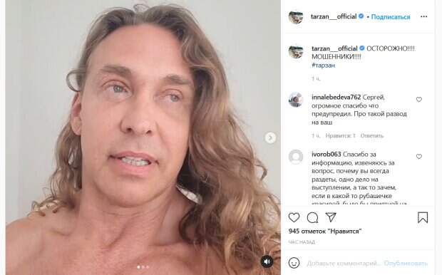 При этом, сам артист о нем ничего не знает. «Срочная информация! Идет бойкая реклама: выступление Тарзана. Наглый молодой человек на все вопросы по телефону отвечает, что это действительно настоящий Тарзан. Ребята, это фейк! Эти люди будут нести ответственность…Я извиняюсь перед всеми, кто попал в эту ситуацию, потому что я только о ней узнал. Извиняюсь, потому что будьте готовы услышать на вопрос «Где Тарзан?» услышать: «Ну такой он артист – послал всех нах**н и не приехал», - поделился своим возмущением Глушко. Стоит отметить, что на видео он позирует на камеру без футболки. Выглядит артист усталым и постаревшим. Возможно, к этому привела стрессовая ситуация. Он также поделился более точной информацией о том, где проводят «его» концерт мошенники. Поклонники тут же отреагировали на пост Тарзана. «Сергей, огромное спасибо что предупредил. Про такой развод на ваш», «Спасибо за информацию, извиняюсь за вопрос, почему вы всегда раздеты, одно дело на выступлении, а так-то зачем», «Наказывать надо таких прытких», - пишут люди. Напомним, муж Королевой Тарзан приспустил трусы перед 75-летней тещей: "В нашей семейке...". Как сообщала Politeka, Наташа Королева в купальнике разозлила сеть, хвастнув отдыхом с Тарзаном: «С жиру беситесь! ». Также Politeka писала, что Наташа Королева после измен Тарзана с размахом отпраздновала 20-ю годовщину отношений: «Я у твоих ног…».