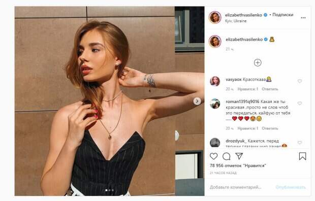 Волосы актриса решила оставить распущенными, а образ дополнила цепочкой на шее. Об этом пишет Politeka.net со ссылкой на страничку знаменитости. Фанаты поставили почти 80 тысяч лайков и написали комментарии: "Какая же ты красивая ,просто не слов чтоб это передаться, кайфую от тебя", "Кажется, перед твоими глазами мир замер", "Богиня однозначно", "Вот эта фотография очень нравится, правда сразу видно, что это Photoshop, ну фон вообще красивый. На Дроне подобрали ракурс фотограф молодец. На свадьбе был стол письменный банановый и очень красиво получилось". Сообщалось, что популярная украинская актриса Елизавета Василенко, которая снималась в сериале «Школа», похвасталась красотой крупным планом. Так, на фотографиях Василенко позирует, сидя на крыше дому с элегантной прической и пикантном наряде. Дополняли образ невероятно красивый макияж девушки, на что обратили внимание ее поклонники. Напомним, Лиза Василенко из «Школы» скинула кофту, засветив упругую грудь в коротком топе А еще Politeka писала, что звезда «Школы» Лиза Василенко сверкнула красотой в экстремальном мини Также Politeka сообщала, что звезда "Школы" Лиза Василенко пикантно обрезала глубокое декольте на фото