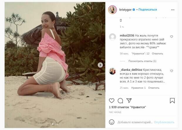 Жена известного украинского ведущего Владимира Остапчука, нотариус Кристина Горняк, блеснула фигурой на пляже Красотка демонстрирует фигуру в стильных нарядах, передает Politeka.net. Недавно супруги отдыхали в теплых краях, а прилетев домой, пара продолжает делиться яркими воспоминаниями. Так, Кристина опубликовала фото, в котором позирует на пляже, присев на песок.