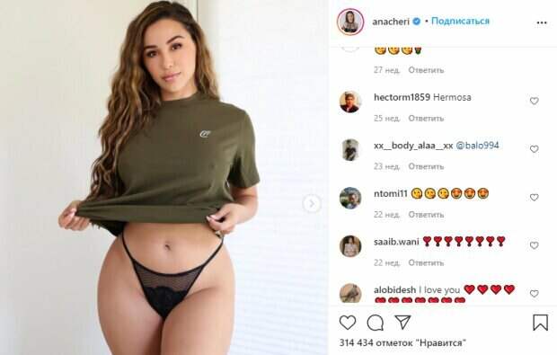 Об этом пишет Politeka.net со ссылкой на страничку знаменитости. "Остров живет в моих байкерских шортах с леопардовым принтом", - подписала фото звезда. Фанаты поставили более 30 тысяч лайков и написали комментарии: "Удачной недели! Люблю эти шорты", "С праздником четверг, детка, обожаю байкерские шорты с леопардовым принтом!", "Эта ель и эта улыбка", "Если вы читаете это, вот вам напоминание: нужно исправить осанку и перестать сутулиться", "Какое у тебя красивое сердце", "Это женщина моей жизни", "Самая большая черная вишня". Сообщалось, что американская фитнес-модель Ана Чери похвалилась пышными формами в белье и одной лишь маечке. На фото видно, как девушка в очередной раз показывает себя в одной лишь майке болотного оттенка и крошечном белье с сеточкой. Напомним, Ана Чери в неприлично маленьком бикини прокатилась на велосипеде А еще Politeka писала, что Ана Чери измазала "пышки" маслом и задала жару на отдыхе Также Politeka сообщала, что Ана Чери в микро-трусиках задрала ножку, чтобы показать всю себя