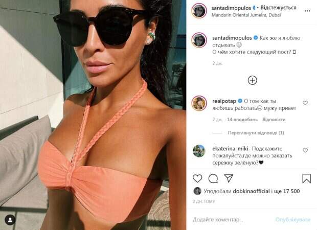 Бывшая солистка ВИА Гры и победительница последнего сезона «Танців з зірками», Санта Димопулос, блеснула загорелым телом в купальнике, зацепив даже Потапа Звезда сейчас с семьей отдыхает в Дубае и делится впечатлениями и соответствующими снимками на своей странице в Инстаграм, пишет Politeka.net. Так, на новом фото Санта Димопулос позировала в соблазнительном пляжном образе.