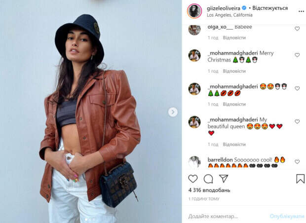Жизель запустила руки в штаны, немного опустив их, что сделало фото особенно горячим. Образ красотка дополнила коричневой кожаной рубашкой, панамкой и маленькой сумочкой. В комментариях стали оставлять Жизель много хороших отзывов. «Ты выглядишь супер мило», «Одна-единственная», «Ты такая красивая - так сильно любишь свой стиль!», «Моя прекрасная королева», «Тебе очень идет этот стиль. Продолжай в том же духе», - пишут пользователи сети. Как известно, сама Оливейра родом из Бразилии. Она приехала покорять США, работая в модельном бизнесе. Красотка снималась для многих рекламных компаний, но главным достижением для нее стало участие в показе Victoria’s Secret. Ранее мы писали, что Жизель Оливейра показала упругий пресс, приподняв свою спортивную кофту. На фото модель позировала в шортиках и кофте, которую решила задрать. Жизель оказалась без бюстгальтера, посветив торчащим бюстом. Напомним, что Жизель Оливейра без лифчика исполнила желания мужчин: "Невероятная девочка". Как сообщала Politeka, Жизель Оливейра впечатлила формами, примеряв тесный наряд: «Ох, эти ноги…». Также Politeka писала, что Жизель Оливейра в пушистом мини показала, как сводит мужчин с ума: «Нежная кошечка».