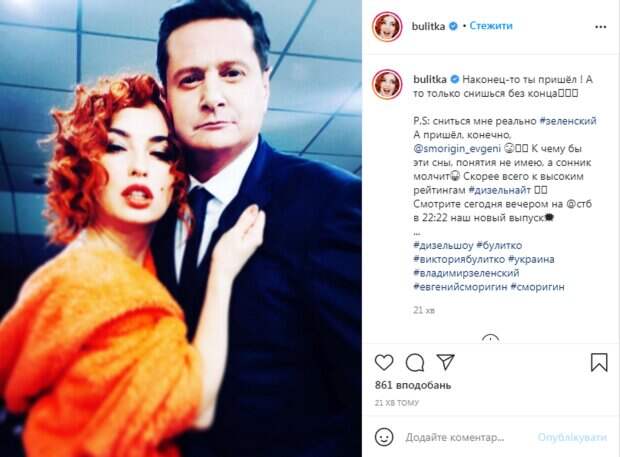 При этом она отметила, что Евгений "наконец пришел", однако во снах она видит именно Зеленского. "Наконец-то ты пришел! А то только снишься без конца. P.S: снится мне реально Зеленский, а пришел, конечно, @smorigin_evgeni. К чему бы эти сны, понятия не имею, а сонник молчит. Скорее всего, к высоким рейтингам #дизельнайт", - написала она. В комментариях артистов засыпали комплиментами, а Викторию даже сравнили с Мерлин Монро. "Боже, какие вы красивые", "Вау", "Похож на одного западного актера", "Прям Мерлин Монро", "Так вот какой ты, Твин Пикс по-украински", "Викуся, ты большая умница! Если тебе снятся сны, значит ты не высыпаешься. Больше гуляй перед сном на свежем воздухе", "Очень красивая", "Вика, ты супер", "Какая красивая девушка", "Обожаю тебя, самая любимая артистка", - пишут в комментариях. Напомним, что Булитко из "Дизель шоу" устроила сольный концерт, разнежившись в ванной с пеной: "случайно..." Как сообщала Politeka, Страстная Булитко из "Дизель шоу" в дерзком мини не на шутку завела мужчин, поза впечатляет: "обалдела" Также Politeka писала, что Подвыпившую Булитко с подружками из "Дизель шоу" еле утащили из клуба: "это просто не пережить"