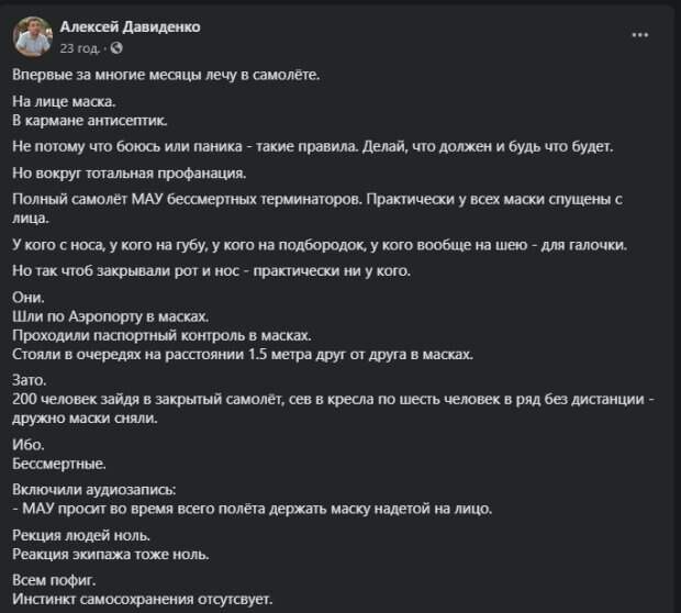 5 метра друг от друга в масках", - отметил блогер. Но, зайдя в самолет обстановка изменилась. "Полный самолёт МАУ бессмертных терминаторов. Практически у всех маски спущены с лица. У кого с носа, у кого на губу, у кого на подбородок, у кого вообще на шею - для галочки. Но так чтоб закрывали рот и нос - практически ни у кого. 200 человек зайдя в закрытый самолёт, сев в кресла по шесть человек в ряд без дистанции - дружно маски сняли. Ибо. Бессмертные", - иронизировал блогер. Он отметил, что даже на просьбу стюардесс одеть средства защиты, люди никак не отреагировали. "Всем пофиг. Инстинкт самосохранения отсутствует. Честно. Я бы этих людей вообще никуда не выпускал. У них распиз**йство и по**изм в крови. Идёт рост. Койки заполняются. Мы 8-е в Европе по количеству заболевших. Мы 15-е в Европе по летальности от короны", - отметил он. Также Давиденко рассказал, как его знакомы скончался из-за китайского вируса. "Поверьте, умереть от вируса в 42 он точно не собирался. А вы и дальше ведите себя как стая тупых и диких обезьян", - заключил блогер. Напомним, с 1 августа адаптивный карантин в Украине будет действовать по-новому, страна поделена на 4 зоны эпидемической опасности, изменен подход к отнесению других стран к красной и зеленой зонам. Напомним, ужесточение карантина в Украине, Ляшко сделал срочное заявление: "После 1 августа..." Как сообщала Politeka.net, новые жесткие запреты с 1 августа, Кабмин принял решение: где закроют ТРЦ и остановят транспорт. Также Politeka писала, что Минздрав ошеломил украинцев новыми сроками окончания карантина: "Будет продлен до...".