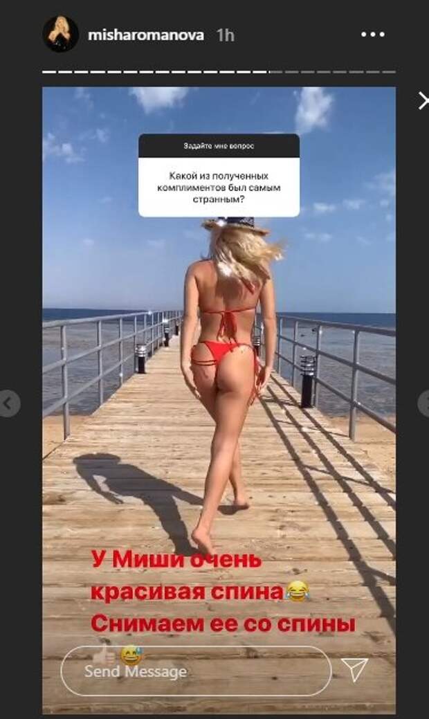Миша Романова босеком пробежалась по доскам с радостной улыбкой, поворачиваясь на ходу. Во время особенно резкого оборота шляпа слетела с ее головы, однако исполнительница со смехом ее поймала. Таким образом знаменитость проиллюстрировала ответ на один из вопросов своих поклонников: "Какой из полученных комплиментов был самым странным?". Саму фразу она дописала ниже: "У Миши очень красивая спина. Снимаем ее со спины". Ранее бывшая солистка группы "ВИА Гра" предстала в смелом образе на лестнице. Для фотосессии она надела лакированный жакет с зелеными разводами и показала раскованную позу прямо на ступенкьках: она растянулась, высоко запрокинула голову и прикоснулась пальцами к собственному подбородку. При этом ее и без того короткое платье немного задралось, придав кадру пикантности, а сама Миша показала на камеру максимально томный вид. Напомним, Миша Романова с озорными косичками хвастнула упругими «шарами» в бикини: «Звезды завидуют тебе» А еще Politeka писала, что ребенок породнил Мишу Романову и Макса Барских, певица ошарашила известием Также Politeka сообщала, что влажная Миша Романова сверкнула завидным бюстом в купальнике