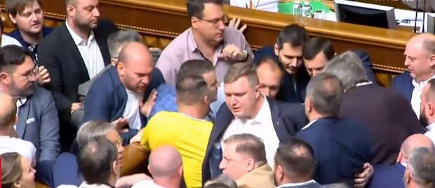 Сегодня, 17 июня, во время пленарного заседания Верховной рады произошла драка прямо на парламентской трибуне, передаёт корреспондент «ПолитНавигатора». Скандал разразился после того, как глава комитета по вопросам гуманитарной и информационной политики, депутат «Слуги народа» Никита Потураев заявил, что эпоха бедности закончится, «когда народ восстанет и расстреляют ОПЗЖ».