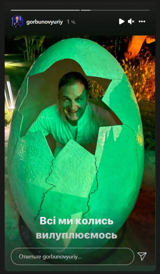 У себя в Инстаграм Горбунов опубликовал кадры, сделанные на море, а также похвастался морскими развлечениями. На снимке артист позировал в необычной статуе в виде большого яйца, из которого кто-то вылупился. Горбунов залез внутрь яйца и выглядывал из отверстия, хитро улыбаясь. «Все мы когда-то вылупляемся», - шутливо подписал фото артист. Отметим, что Юрий Горбунов вместе со своей женой Катей Осадчей стараются часто отдыхать. Звездная пара всегда находит время в своем плотном графике, чтобы провести его на море. Только за этот год парочка несколько раз летала в теплые края. Напомним, что Горбунов нашел себе замену на "Танцях з зірками": "Можно идти на пенсию". Как сообщала Politeka, Юрий Горбунов рассказал, что вызывает у него гордость за соотечественников: "Давайте ценить...". Также Politeka писала, Горбунов растрогал фотографией с младшим сыном: «Наша любовь».