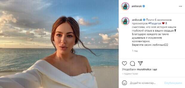 Оказалось, что там же, на сказочном побережье Ани снимала свой новый клип "Раздетая", который менее, чем за неделю собрал почти 6 миллионов просмотров. В этот раз в своем микроблоге Лорак опубликовала милое фото все с тех же Мальдив, на котором появилась в образе из клипа, а в подпсии к публикации поблагодарила своих фанатов. На снимке Ани позирует в роскошном белоснежном платье, которое оголил изящные плечи и шею. Ее волосы собраны в небрежную прическу, а на лице легкий макияж, она внимательно смотрит в объектив. В подписи к публикации Лорак написала: "Почти 6 миллионов просмотров #Раздетая. Я счастлива, что моя история нашла глубокий отзыв в ваших сердцах. Благодарю каждого за такие душевные и искренние комментарии. Берегите своих любимых". Пользователи тут же принялись активно обсуждать новое фото звезды, засыпая ее комплиментами в комментариях: "Спасибо за такую песню, с момента релиза на репите", "Спасибо за эту песню! Мы ее так долго ждали!", "Счастья вам, Каролина. Мы вас очень любим, скучаем и ценим. Будьте любимы, а мы вас поддержим всегда", "То ли девочка, а то ли видение", "Спасибо за эту прекрасную песню и клип, очень нравится!". Напомним, 42-летняя Ани Лорак в наряде для девочки-подростка устроила забавные пляски на сцене: фото Как сообщала Politeka, Ани Лорак хвастнула ногами в образе бизнес-леди, надев черные лосины и блузу: фото Также Politeka писала, Ани Лорак в радужном бикини показала готовность к лету: "Фигура - мечта каждой девушки"