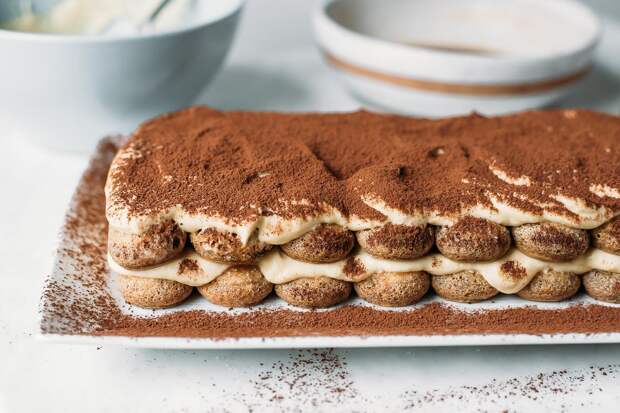 Самый быстрый тирамису. Это не настоящий тирамису, но очень вкусный и похожий на него десерт. Ингредиенты: Песочное печенье — 8 шт.; Маскарпоне — 300 гр.; Сливки 33% — 100мл.; Сахар — по вкусу; Кофе — 200 мл.; Какао — для посыпки. Способ приготовления: Взбейте миксером сыр маскарпоне, сливки и сахар.