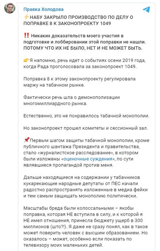 "НАБУ закрыло производство по делу о поправке №8 к законопроекту №1049. Никаких доказательств моего участия в подготовке и лоббировании этой поправки не нашли. потому что их не было, нет и не может быть", – заявил он. Нардеп напомнил, что речь идет о событиях 2019 года, когда Рада проголосовала за законопроект. Парламент поддержал этот закон в октябре 2019-го, но в феврале 2020 года президент Владимир Зеленский наложил на него вето. "Поправка №8 к этому законопроекту регулировала маржу на табачном рынке. Фактически речь шла о демонополизации многомиллиардного рынка. Естественно, это не понравилось табачной монополии. Но законопроект прошел комитеты и сессионный зал. Первым шагом защиты табачной монополии, кроме публичного шантажа президента и правительства, стало "журналистское расследование", в котором были изложены "оценочные суждения", по сути являвшиеся пропагандой против меня. Дальше находящиеся на содержании у табачников кукарекающие народные депутаты от ПЕС начали радостно распространять изложенные в медиа фейки и тем самым защищать монополию политически", – написал Холодов. Он добавил, что расследование Национального антикоррупционного бюро по этому поводу длилось полтора года. "Масштабы бреда были колоссальными – якобы поправка, которая не вступила в силу, и к которой я не имел отношения, принесла бюджету ущерб в 300 млн (что?!). Я даже не сразу понял, как в такое может поверить человек с высшим образованием. Но оказалось – может, особенно, если показать по телевизору моих маленьких детей. Вот так работают чернуха и манипуляции. Затем было открыто производство НАБУ "по факту", которое пропаганда мгновенно перекрестила в "дело Холодова". Расследование несуществующей проблемы затянулось на целых полтора года. Все это время следователи получали зарплату за бессмысленную деятельность", – подчеркнул политик. Народный депутат сообщил, что также он выиграл суд против Национального агентства по вопросам предотвращения коррупции, которое попыталось его привлечь к ответственности по этому делу. "Когда расследование прогнозируемо зашло в тупик, оппоненты подтянули дополнительные силы. НАПК составило административный протокол против меня, в котором попыталось легализовать фейки из СМИ в виде юридического документа. Но я заблокировал им эту схему. Суд против НАПК я выиграл еще в апреле", – сообщил Холодов.