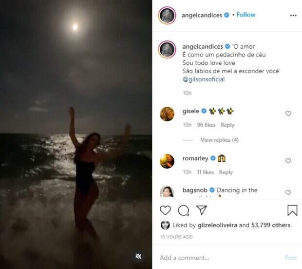 Несмотря на позднее время суток, ее очень хорошо видно благодаря яркой Луне. Наряд подчеркнул стройную фигуру Кэндис и сделал акцент на ее ягодицах. Модель показала захватывающие движения, посверкав своими идеальными ножками на фоне моря. Свое настроение знаменитость выразила в стихах: "О, любовь... Это как маленький кусочек рая Я вся люблю любовь Медовые губы скрывают тебя". Чуть ранее Кэндис Свэйнпол сфотографировалась в том же наряде при свете дня. Девушка повернулась спиной к камере, а лицом в сторону моря, она запрокинула руки за голову и соблазнительно скрестила ноги на песке. "Дитя луны", - подписала кадр сама модель. Пользователи cоцсети в комментариях оставили ей много приятных комплиментов: "Ты наша гордость"; "Так красиво и до сих пор восхваляет бразильскую культуру!
