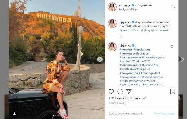 Звезда надела также обтягивающие шортики, выделившие размеры ее упругих ягодиц. Стройная талия, подкаченные ножки - это идеальная фигура достойна всех похвал. Звезда сделала себе простую прическу, забрав волосы в пучок. В руках она держала красную банку с напитком. Кассандра позировала на капоте машины, демонстрируя свои шикарные части тела со всех ракурсов и широко улыбаясь. "Кто-нибудь еще шепчет, что за фигня, по крайней мере, 1000-ый раз сегодня ?!