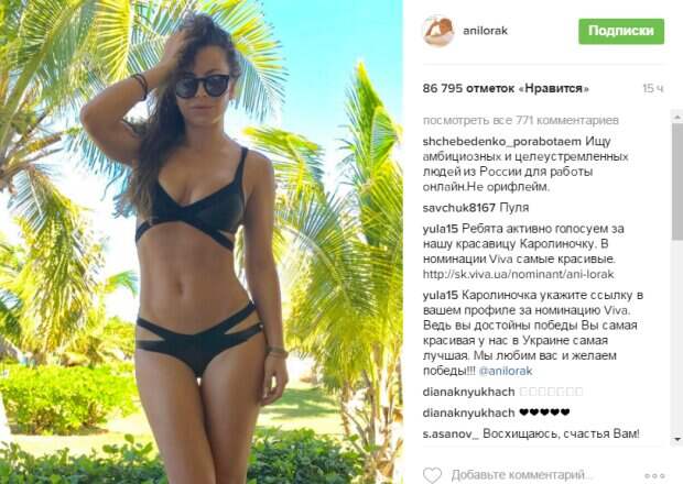 Фигура украинской певицы Ани Лорак совершенна, поэтому любой купальный наряд на ней смотрится чудесно. Темное бикини с резинками придали образу некой пикантности. Это фото просто взорвало сеть. Сочная блондинка Тина Кароль поразила красотой в голубом бикини. Такие формы достойны только комплиментов. Пышногрудая певица Анна Седокова обладает невероятной внешностью. Фигура в купальнике стоит всяких похвал, и никто не скажет, что эта красотка родила троих детей. Российская актриса Кристина Асмус решила покорить совершенством тела в бикини. При этом фантастическая красотка сняла верх купальника. В таком образе она предстала на Мальдивах. Игривая Настя Каменских покорила идеальностью своих форм в крохотном бикини. Звезда представила яркое фото в Инстаграм, такую красотку трудно забыть. Светлана Лобода на отдыхе выбирает только бикини. На этом фото красотка повернулась спиной к фотографу и сверкнула подкаченной пятой точкой. Напомним, Ани Лорак похвасталась образом в черном спортивном костюме, состоящем из короткого топа и лосин. Фигура у красотки просто великолепна. Певица утверждает, что лучшие диеты для артиста - это живые концерты. Напомним, что Лорак в коротком топе посветила грудью под носом у Лазарева Как сообщала Politeka, Лорак засветила исхудавшую фигуру в пустом спортзале Также Politeka писала, что Ани Лорак с мохнатыми ногами удивила несуразным нарядом на домашнем фото