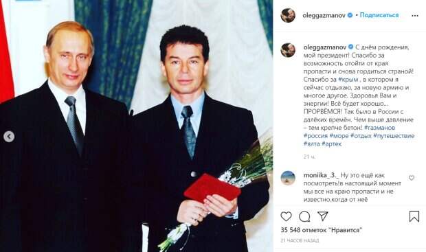 Российский певец Олег Газманов поздравил Владимира Путина с днем рождения, но поплатился Как передает Politeka.net, артист, который яро поддерживал аннексию Крыма, написал теплые слова лидеру РФ на своей страничке в Instagram. "С днём рождения, мой президент! Спасибо за возможность отойти от края пропасти и снова гордиться страной!