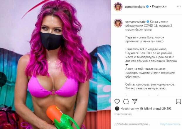 Сейчас Усманова очень популярна, на ее Инстаграм подписаны 3,3 миллиона пользователей сети. Блондинка активно делится с подписчиками всеми новостями из жизни. В этот раз Усманова расстроила своих фанатов информацией о том, что заболела китайским вирусом. А подкрепила она запись очень горячим фото. Тренер позировала в розовом бикини. Грудь звезды красиво смотрелась в натянутой ткани. Волосы модели были розовыми, а на лицо она надела маску. В руках же красотка держала игрушечный пистолет. Екатерина рассказала - узнав о диагнозе, она сразу подумала, что ей повезло заболеть в легкой форме. "Началось всё 2 недели назад. Случился ЛАКТОСТАЗ на ровном месте и температура. Прошёл за 2 дня как обычно с помощью Полины❤️ А вот на той неделе начался насморк, недомогание и отсутствие обоняния. Сейчас самочувствие нормальное. Только запахов не чувствую. Вторая мысль - Слава Богу, что теперь от меня все отстанут )) и я могу отдохнуть)