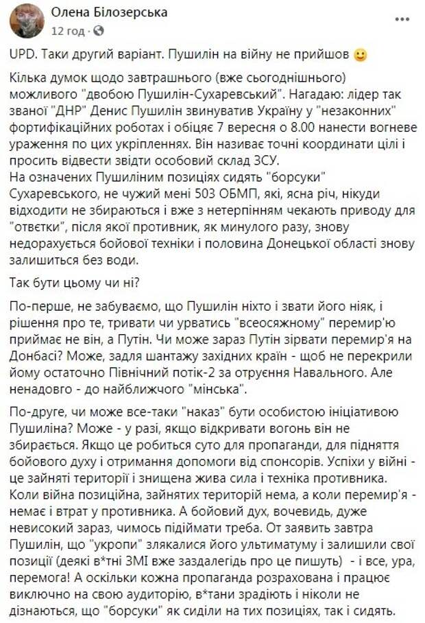 "На указанных Пушилиным позициях сидят "барсуки" Сухаревского, не чужой мне 503 ОБМП, которые, понятное дело, никуда отходить не собираются и уже с нетерпением ждут повода для "ответки", после которой противник, как в прошлый раз, вновь недосчитается боевой техники, и половина Донецкой области снова останется без воды", - написала Билозерская. Впрочем, по словам военной, на самом деле Денис Пушилин - "никто и звать его никак", и решение о том, продолжаться или сорваться "всеобъемлющему" перемирию принимает не он, а президент РФ Владимир Путин. По мнению военной, Путин мог бы сорвать перемирие на Донбасс ради шантажа западных стран - чтобы не перекрыли ему окончательно "Северный поток-2" за отравление Навального. Впрочем, по мнению Билозерской, срыв перемирия продлился бы недолго - до ближайших переговоров в Минске. Если же "приказ" об открытии огня был личной инициативой Пушилина, это значит, что на самом деле открывать огонь главарь "ДНР" не собирается. "Если это делается чисто для пропаганды, для поднятия боевого духа и получения помощи от спонсоров", - подчеркнула военная. По мнению ветерана войны на Донбассе, вряд ли боевики устроят что-то серьезнее привычных позиционных перестрелок - например, наступление противника при поддержке российских регуляров, без которых они наступать не могут. Напомним, угрозы главаря боевиков Пушилина оказались пустым звуком: "ВСУ приготовились, но...". Как сообщала Politeka, скандал разгорелся в верхушке "ДНР", Пушилин пошел наперекор Басурину. Также Politeka писала, что российский наемник избил шишку из " ДНР " Басурина в ресторане Донецка.