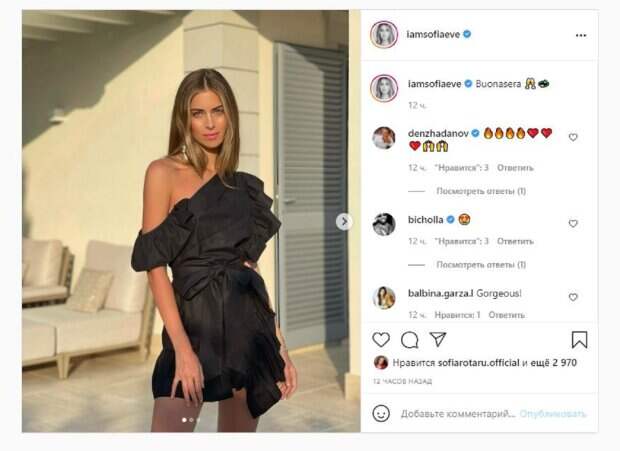 На новом фото Соня Евдокименко появилась в черном платье с поясом на талии. У девушки было открыто одно плечо, а сам наряд был довольно короткий, ведь не доставал даже до колена. "Добрый вечер", - написала Соня под фото. Фанаты, включая Софию Ротару, поставили почти 3 тысячи лайков и написали комментарии: "Безумно красивая", "Икона стиля", "Оглушительная", "Какая обворожительная", "Нежность", "Очень красивая", "Поздравляем", "Невероятно прекрасная София", "Добрый вечер", "Как всегда - красавица", "Вау, какая фигура, какой у вас рост и вес", "Какая Порода!!!! Вы - великолепны". Напомним, внучка Ротару, влюбившаяся в миллионера, предстала в белоснежном платье от украинского дизайнера А еще Politeka писала, что внучка Софии Ротару покорила красотой на отдыхе в компании пушистого друга Также Politeka сообщала, что внучка Ротару в коротком топике показала, какой смелый образ выбирает вдали от дома