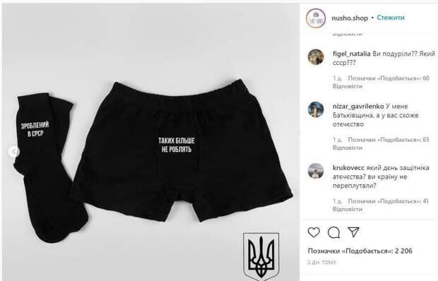 Бренд выпустил набор трусов и носков с забавными надписями. «Мужики не плачут, но лучше не проверять», «Себе помоги, я справлюсь сама» и – о, ужас! – «Сделан в СССР, таких больше не делают». Последний комплект переключил тумблер в голове у некоторых подписчиков, и они стали забрасывать аккаунт оскорблениями. Комментарии подчистили, но скрин остался: Источник: скриншот из Instagram Владельцы магазина решили не вестись на провокации, забанили нарушителей порядка и запретили у себя политические заявления. Также они объяснили, что принт с СССР касается старшего поколения мужчин и попросили оставить в покое людей, которым он понравился. «Хотим коротко объяснить, что мы не преследуем никаких политических взглядов и идеологий, а хотим, чтобы наши принты были максимально универсальными и уместными под различные жизненные ситуации. Также отметим, что принт об СССР несет посыл к нашим папам и дедушкам, которые действительно родились в это время. И это факт. Для тех людей, кому не нравится этот принт — это ваше право, потому что мы в свободной стране и важно мнение каждого украинца. Но просим вас уважать мнения и других ваших земляков». Напомним, что закон о декоммунизации, на который обычно ссылаются, распространяется на государственные символы СССР, портреты вождей и цитаты из их работ. На практике же могут уволить за советскую песню, устроить сетевую травлю за ностальгический пост или устроить разбирательство из-за антикапиталистических плакатов на митинге. Мы бы предположили, что скоро вообще вымарают любое упоминание о коммунистах, но кого тогда будут винить в сегодняшних проблемах? К слову, в нарушение закона львовский горсовет приказал демонтировать памятный знак с кладбища с Лычаковского кладбища, хотя могилы не подпадают под декоммунизацию. Понравился материал? Поставьте ему 5 звезд. Это важно для автора.