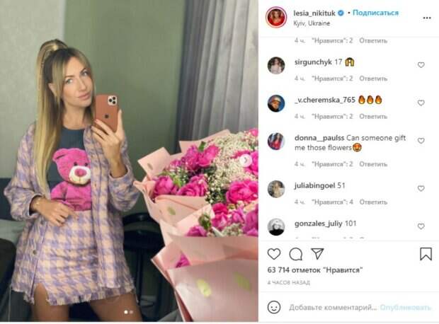 Звезда была в футболке с принтом в виде розового мягкого медведя-игрушки на груди, удлиненном пиджаке и мини-юбке с маленьким разрезом и бахромой. Длинные ровные локоны были собраны в высокий хвост, а также оставлены по бокам на плечах звезды. «Сколько цветов в букете? Кто угадает – с меня лайк и подписка». «Либо 101 ;)); Какая красота; Красивый букет красивой девушке❤️; Мне кажется, или кто-то плагиатит Надю Дорофееву?; 1001 штука; Лучик света