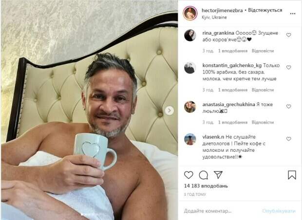 48-летний судья украинского кулинарного шоу "МастерШеф" Эктор Хименес-Браво удивил неожиданным признанием Как передает Politeka.net, шеф-повар опубликовал новые снимки в своем микроблоге в Инстаграм. Но одном из них улыбающийся Эктор Хименес-Браво запечатлен, лежа в постели. В руках он держит небольшую чашку с сердечком на ней.