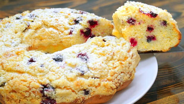 Список продуктов:Для теста: 2 яйца 100 г сахара или по вкусу 130 г кефира 70 г растительного или сливочного масла 230 г муки 1 ч. л. разрыхлителя щепотка соли, ваниль 100 г ягод (замороженные) цедра апельсина (по желанию) Хрустящая крошка: 40 г сливочного масла 60 г муки 40 г сахара щепотка соли Еще понадобится форма диаметром 23 см.