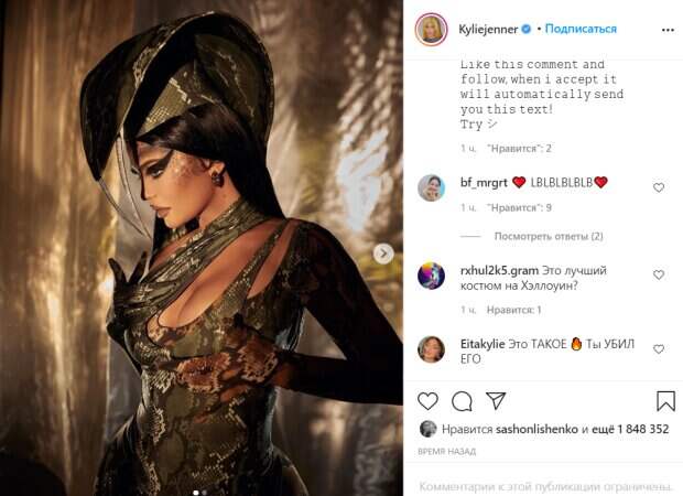 Несколько часов назад она примеряла необычный образ Королевы Змеи, продемонстрировав его в Instagram. Она надела костюм из черно-серой ткани, который составили лосины и облегающий рваный топ из ткани имитирующей змеиную кожу, а также изюминка лука – ассиметричное декольте, которое практически полностью оголило грудь Дженнер и маска кобры на голове. В дополнение соблазнительно аутфита Кайли подобрала прозрачные перчатки, а также кольца с черного золота. Волосы юная красавица выпрямила, а макияж сделала весьма необычным - модель нарисовала на лице змеиную кожу и нанесла на глаза черные крупные стрелки. Снимки она подписала коротко: "Король Кобра. Спасибо тебе". Фанаты знойной представительницы знаменитой династии просто взорвали страницу девушки своими восторженными комментариями. "Королева